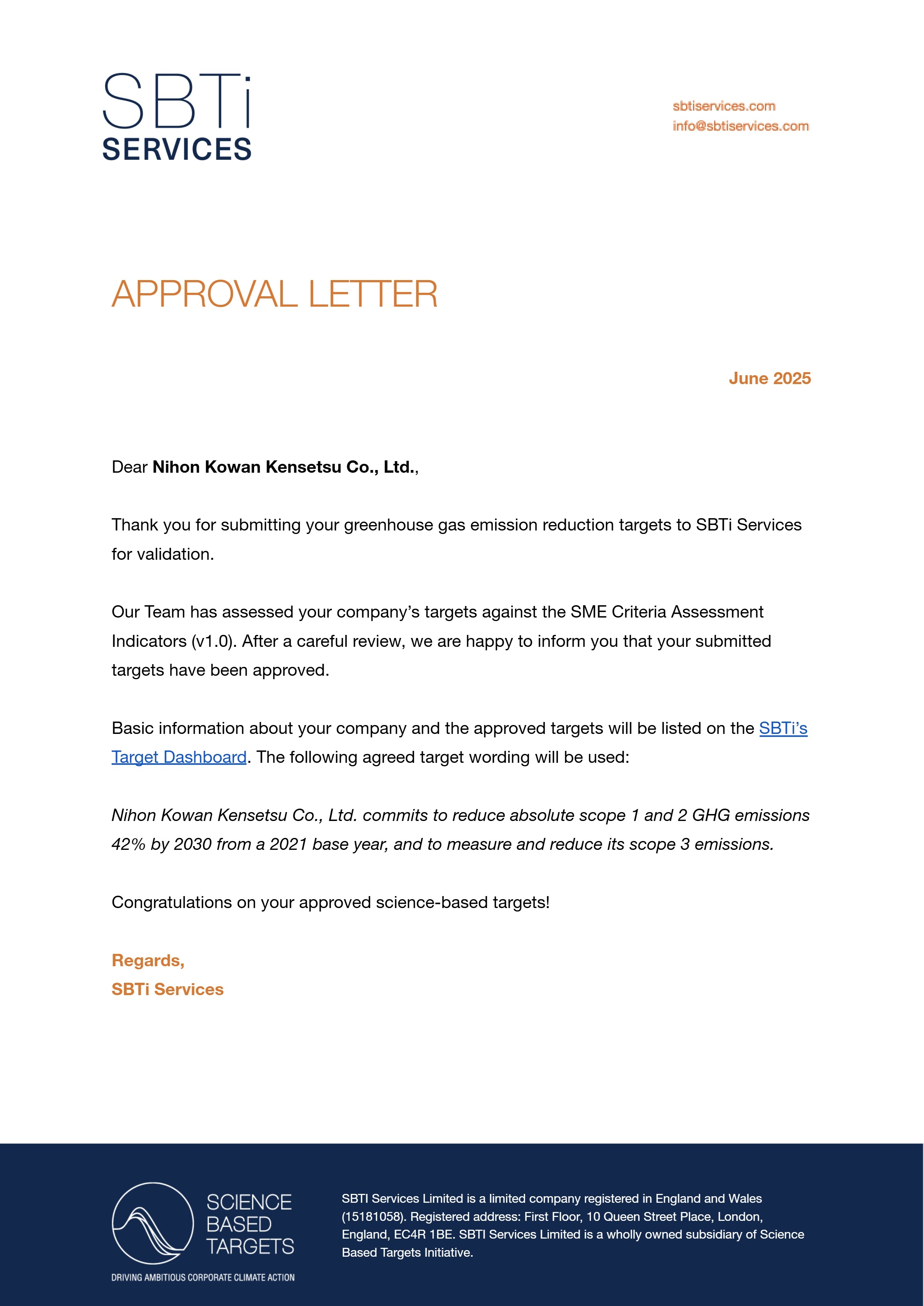日本港湾建設株式会社は、脱炭素の国際認証である中小企業版SBT(Science Based Targets)の認定を取得しました。