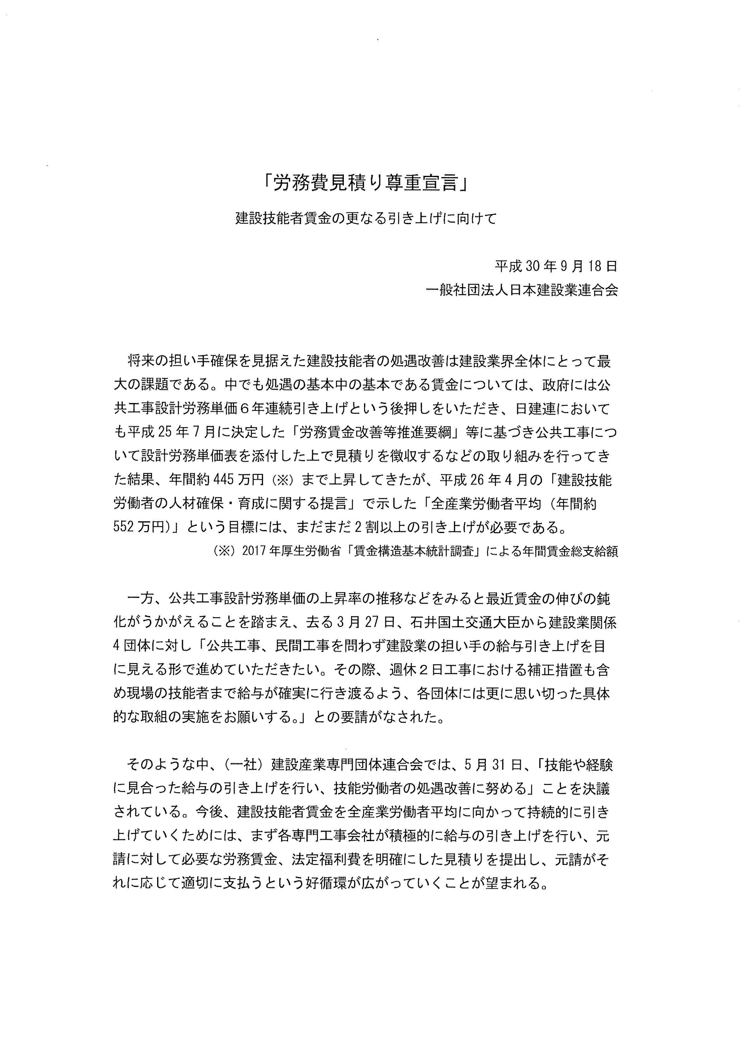 当社は一般社団法人日本建設業連合会(日建連)の「労務費見積り尊重宣言」に基づき協力会社様と契約を結ぶ際には、適切な労務費(労務賃金)を明示した見積書をご提示いただき、建設技能者の処遇改善と担い手の確保に向けた取り組みを図ってまいります。